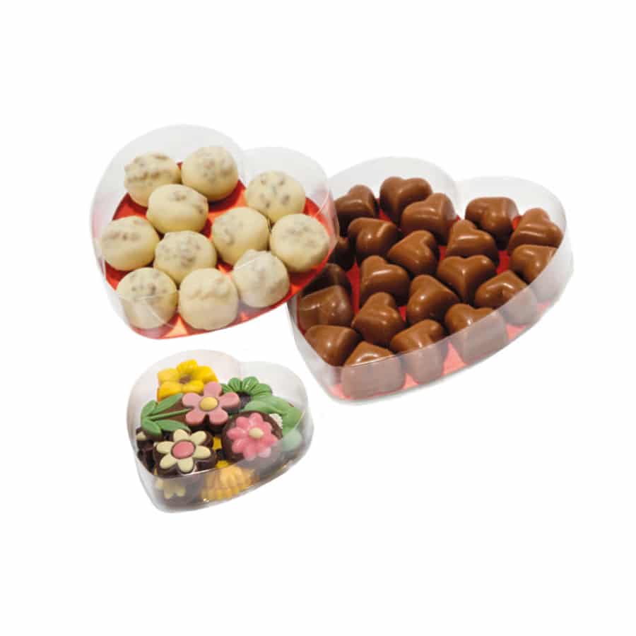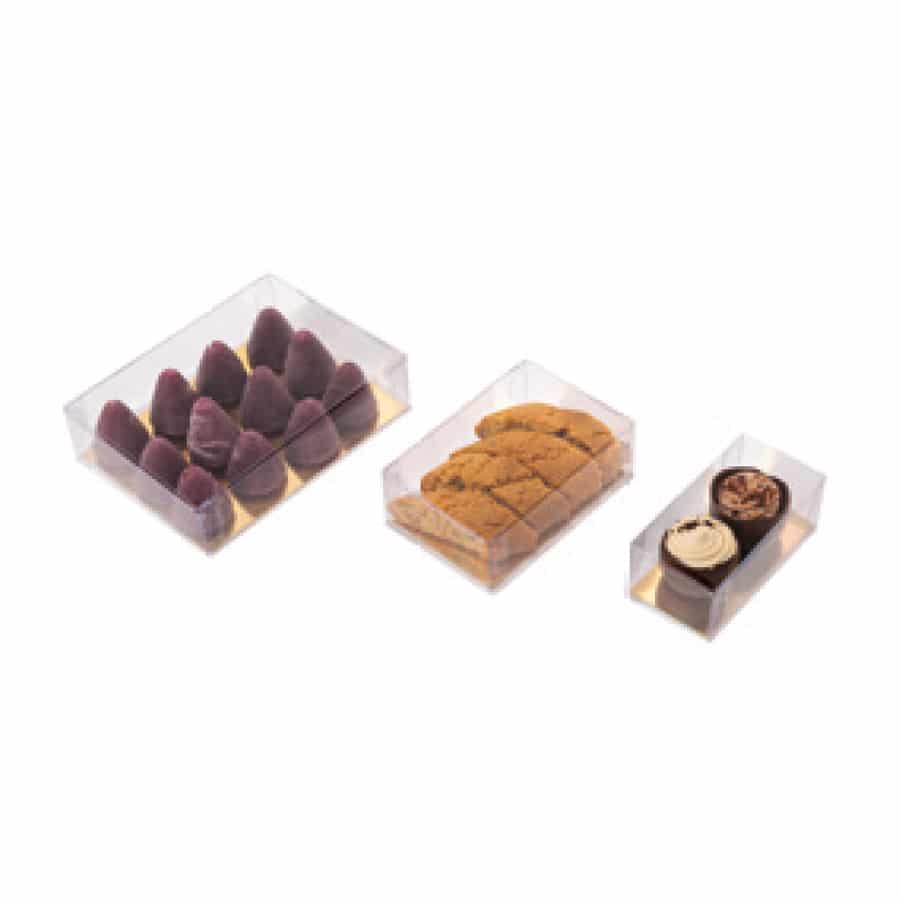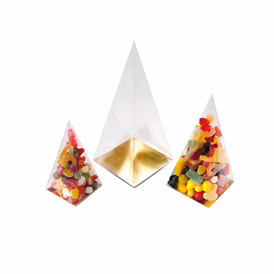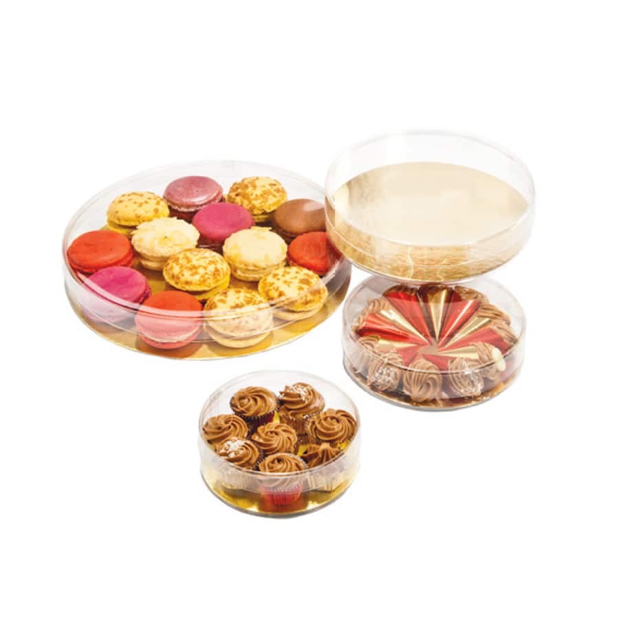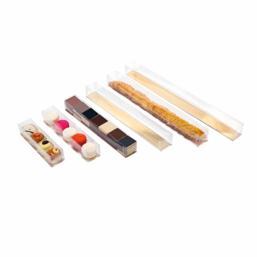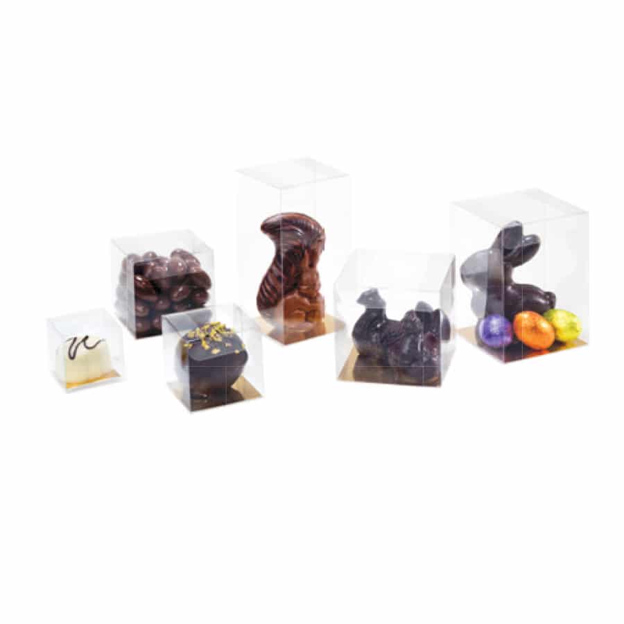 Notre collection comprend plus de 150 références, incluant des boîtes carrées, rectangulaires, rondes, des tubes, des pyramides et des cœurs. Chaque modèle est décliné en plusieurs dimensions pour s’adapter parfaitement à vos produits, qu’il s’agisse de pralinés, de moulages ou d’assortiments variés.